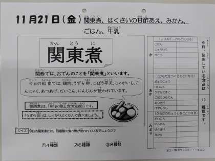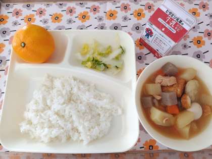 11/21今日の給食は「関東煮、はくさいの甘酢あえ、みかん、ごはん、牛乳」です。
