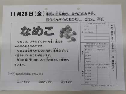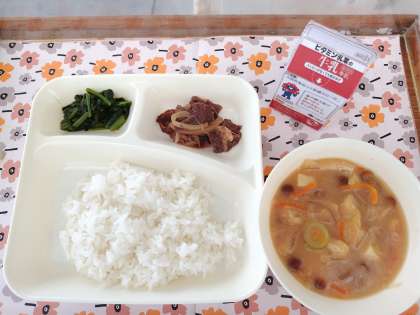 11/28今日の給食は「牛肉の甘辛焼き、なめこのみそ汁、ほうれんそうのおひたし、ご飯、牛乳」です。
