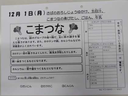 12/1今日の給食は「さばのおろしじょうゆかけ、五目汁、こまつなの煮びたし、ごはん、牛乳」です。