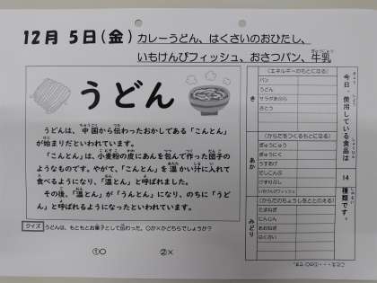 12/5今日の給食は「カレーうどん、はくさいのおひたし、いもけんぴフィッシュ、おさつパン、牛乳」です。