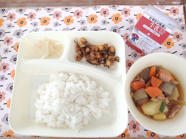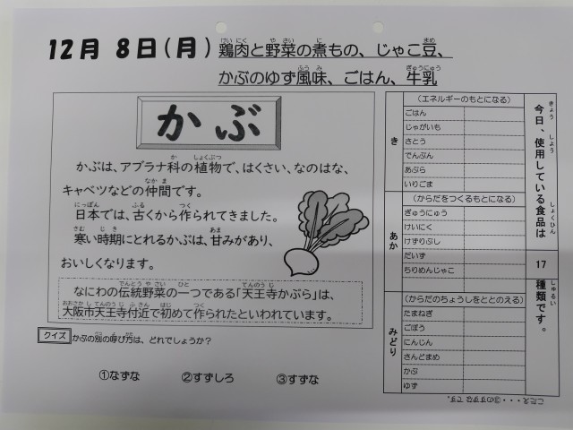 12/8今日の給食は「鶏肉と野菜の煮もの、じゃこ豆、かぶのゆず風味、ごはん、牛乳」です。