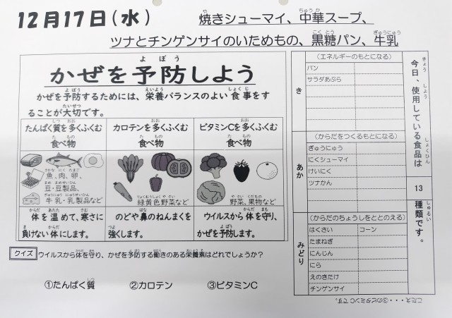 12/17今日の給食は「焼きシューマイ、中華スープ、ツナとチンゲンサイのいためもの、黒糖パン、牛乳」です。