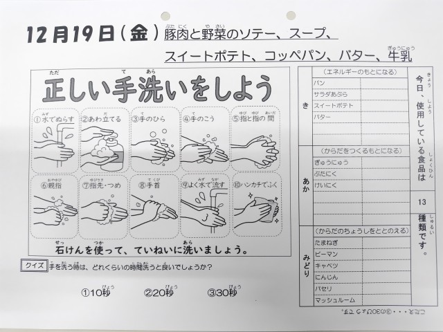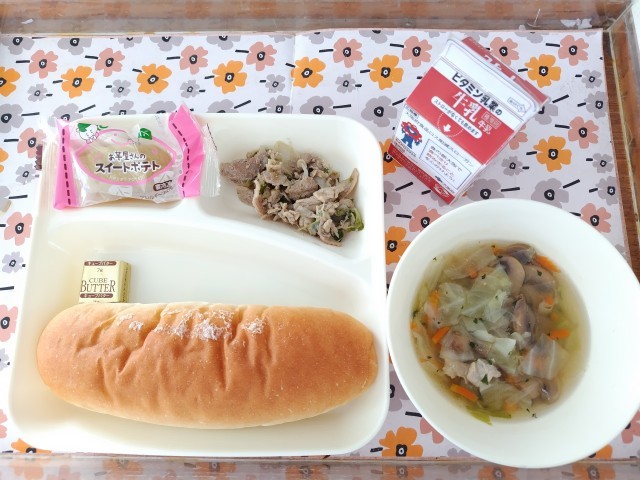 12/19今日の給食は「豚肉と野菜のソテー、スープ、スイートポテト、コッペパン、バター、牛乳」です。