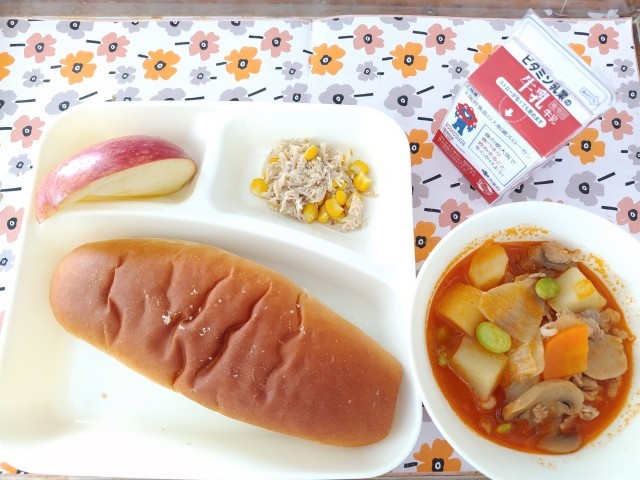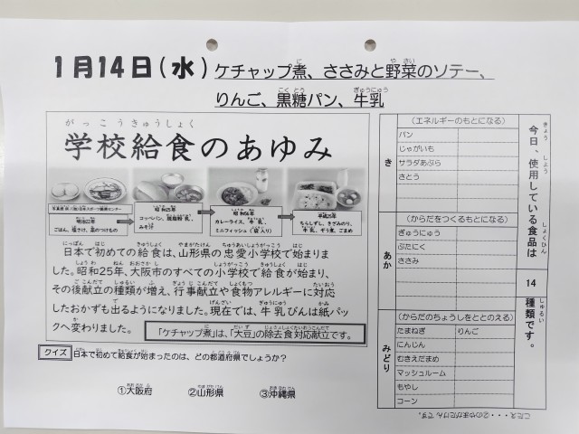 1/14今日の給食は「ケチャップ煮、ささみと野菜のソテー、りんご、黒糖パン、牛乳」です。