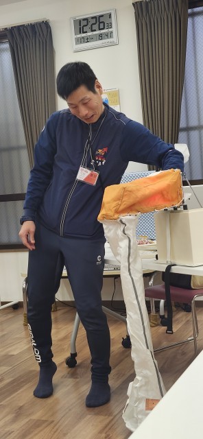 地域の皆さんが防災学習のご指導を終えた後、磯路会館に集まってふり返りをしている時、高学年が見せていただいた救助袋を、大人にも見せてもらいたいと、防災士さんが再演してくださっている様子です