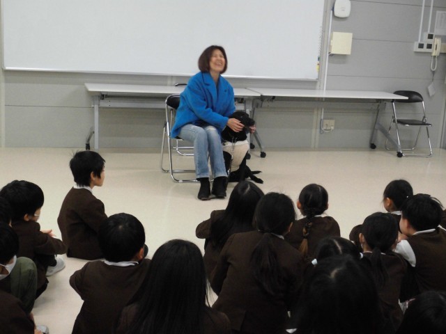 1月27日(火)、浅井純子さんこと「じゅんじゅんさん」と一緒に、視覚障がい者と盲導犬について学びました。初めて知ることがたくさんあり、みんな熱心に話を聞いていました。
