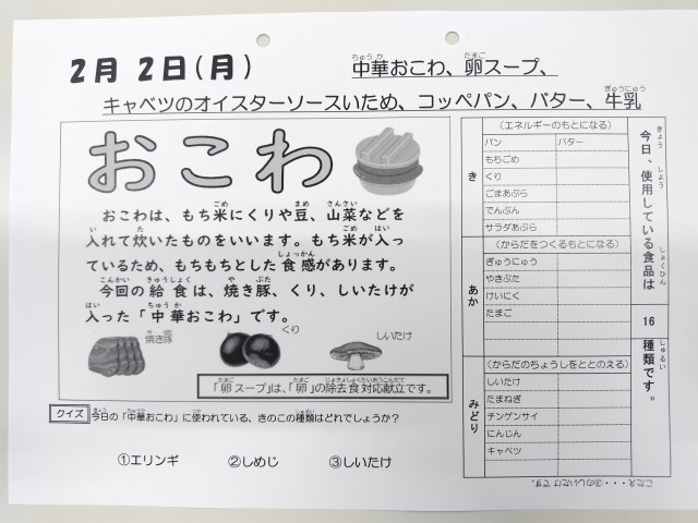 2/2今日の給食は「中華おこわ、卵スープ、キャベツのオイスターソースいため、コッペパン、バター、牛乳」です。