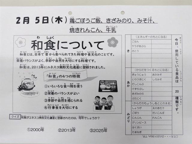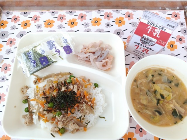 2/5今日の給食は「鶏ごぼうご飯(袋・きざみのり)、みそ汁、焼きれんこん、牛乳」です。