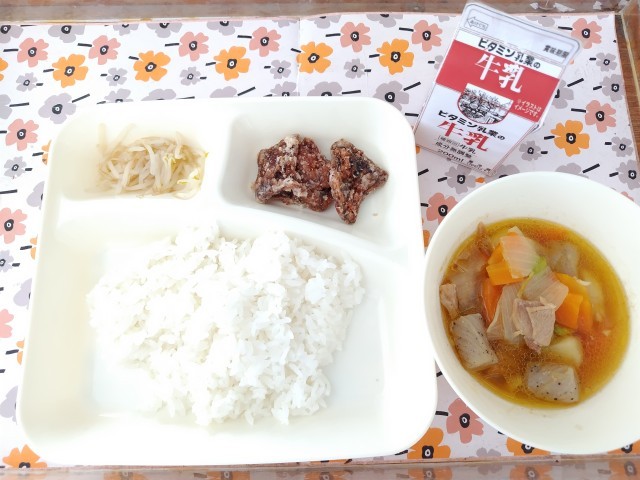 2/6今日の給食は「くじらのたつたあげ、豚肉とじゃがいもの煮もの、もやしの甘酢あえ、ごはん、牛乳」です。
