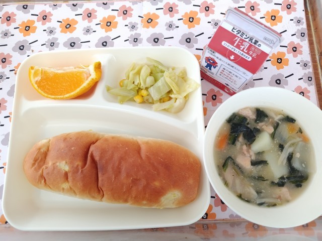 今日の給食は「鶏肉とほうれんそうのシチュー、キャベツとコーンのサラダ、デコポン、おさつパン、牛乳」です。