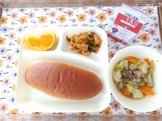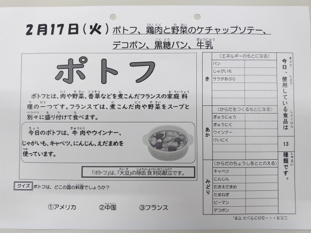 2/17今日の給食は「ポトフ、鶏肉と野菜のケチャップソテー、デコポン、黒糖パン、牛乳」です。