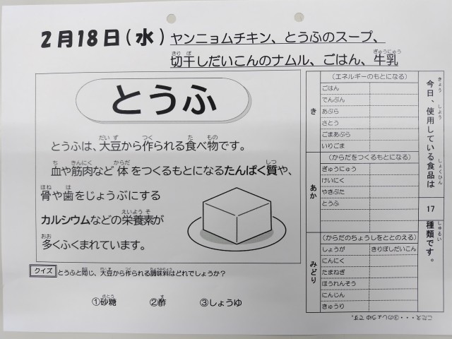 2/18今日の給食は「ヤンニョムチキン、とうふのスープ、切干しだいこんのナムル、ごはん、牛乳」です。