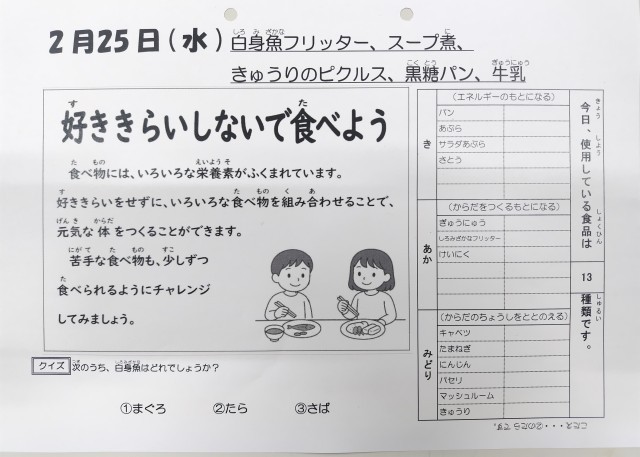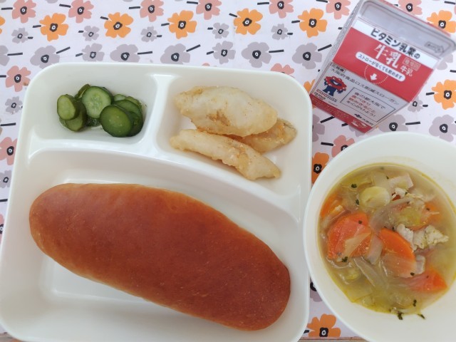 2/25今日の給食は「白身魚フリッター、スープ煮、きゅうりのピクルス、黒糖パン、牛乳」です。