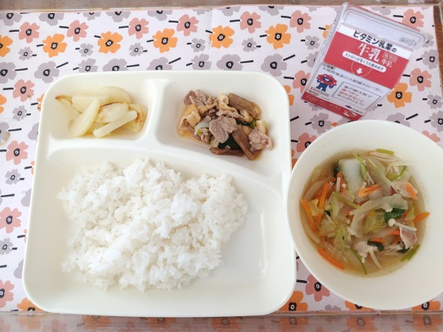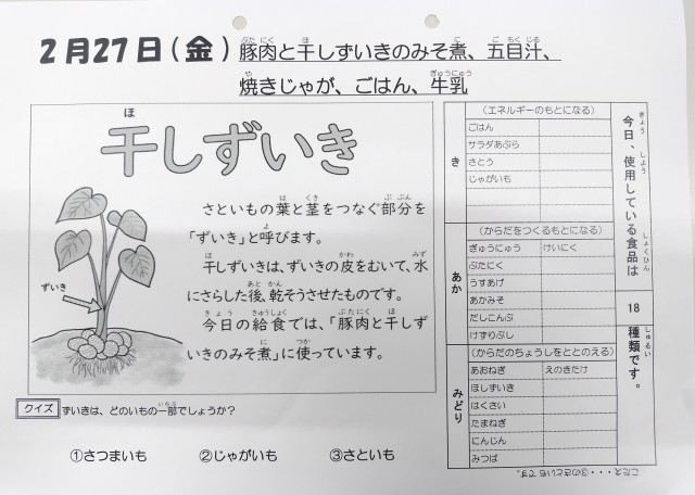 2/27今日の給食は「豚肉と干しずいきのみそ煮、五目汁、焼きじゃが、ごはん、牛乳」です。