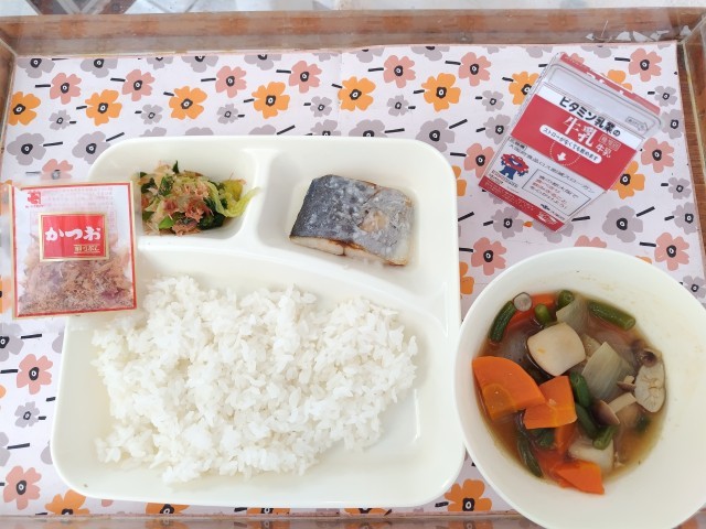 3/5今日の給食は「さごしの塩こうじだれかけ、さといもと野菜の含め煮、なのはなのおひたし、かつおぶし、ごはん、牛乳」です。
