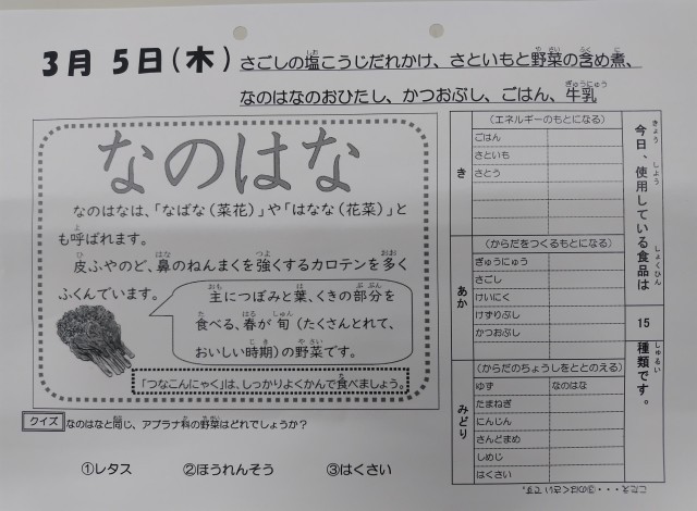 今日のなのはなのおひたしは年1回3月に登場する献立です、季節感を感じますね!