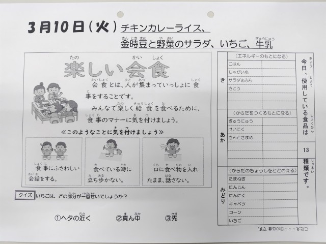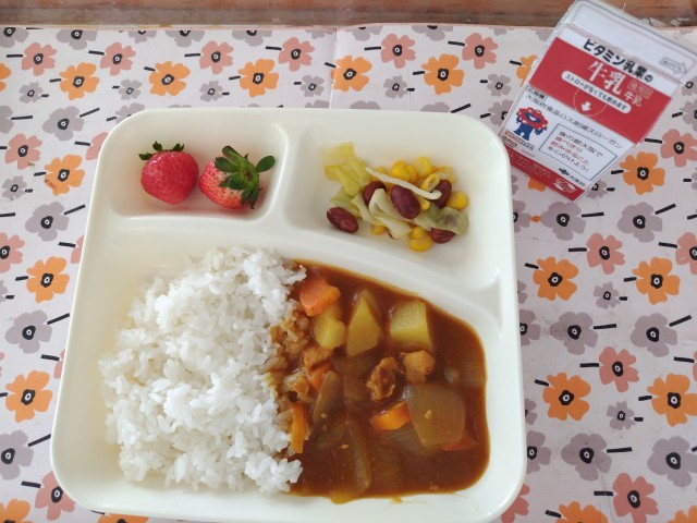 3/10今日の給食は「チキンカレーライス、金時豆と野菜のサラダ、いちご、牛乳」です。