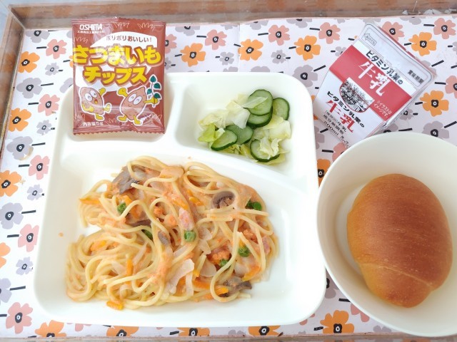 3/13今日の給食は「さけのスパゲッティ、キャベツときゅうりのサラダ、おさつチップス、ミニコッペパン、牛乳」です。