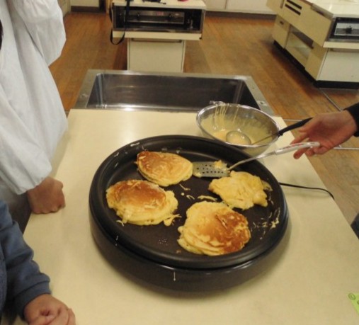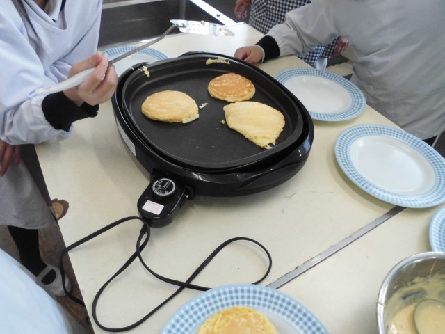 3年生から6年生の各班でホットケーキを焼きました。