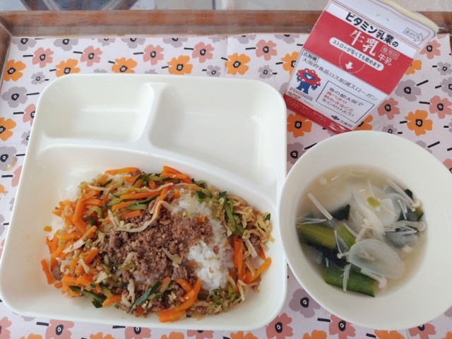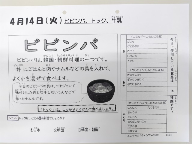 4/14今日の献立は「ビビンバ、トック、牛乳」です。