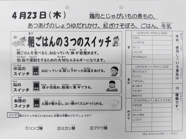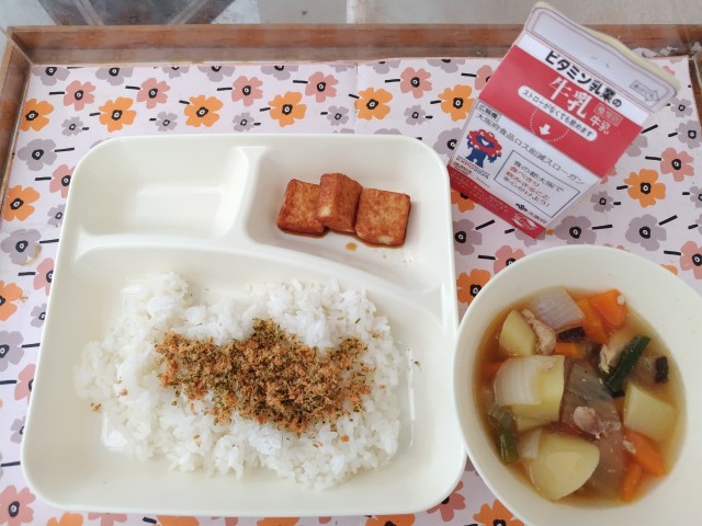 4/23今日の給食は「鶏肉とじゃがいもの煮もの、あつあげのしょうゆだれかけ、紅さけそぼろ、ごはん、牛乳」です。