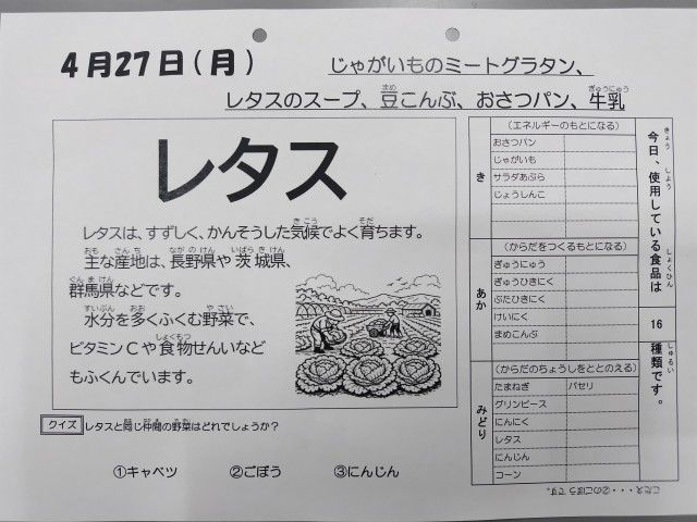 4/27今日の給食は「じゃがいものミートグラタン、レタスのスープ、豆こんぶ、おさつパン、牛乳」です。  今日のじゃがいものミートグラタンは児童に人気の献立です。