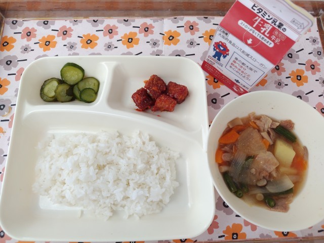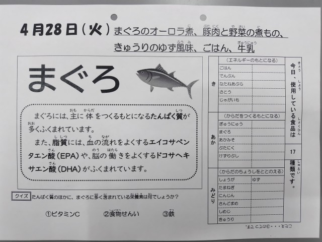 4/28今日の給食は「まぐろのオーロラ煮、豚肉と野菜の煮もの、きゅうりのゆず風味、ごはん、牛乳」です。