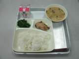 今日の給食は、なまりぶしのしょうが煮、みそ汁、ほうれんそうのおひたし、ごはん、...