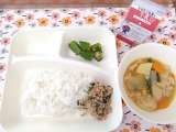 7/17今日の給食は「鶏肉と一口がんもの煮もの、オクラの梅風味、ツナっ葉いため、...