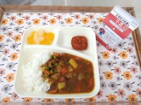 入学して、はじめての給食です。6年生が準備を手伝ってくれました。カレーライス、大...