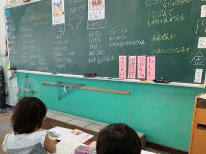 行ってはいけない裏山で遊ぼうと誘われたぽんたの心情を通して、「迷ったときはどうしたらいいのか」について考えました。自分ならどうするか、ワークシートにまとめました。