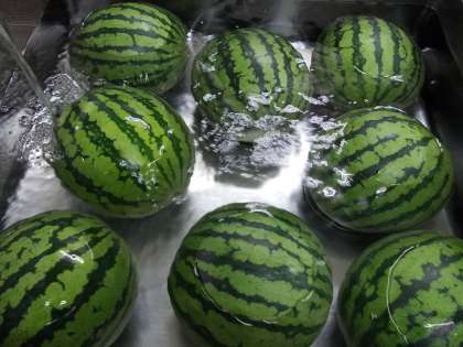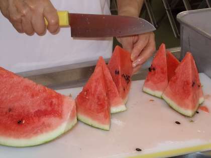 調理員さんが、よ〜く冷やしたすいか1玉を64個に切り分けます。