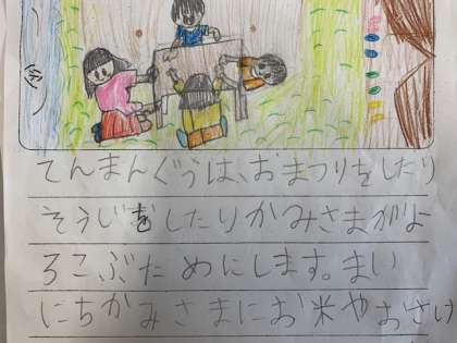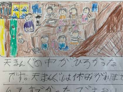 町たんけんの振り返りを、絵と文章でまとめました。三先の町をますます好きになった児童たち。次は、タブレットで撮影した写真を使って、みんなに発表します。