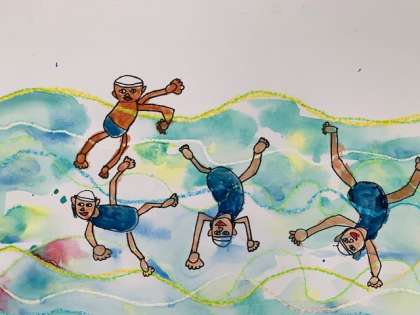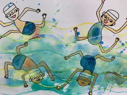 大好きなプール学習の様子を描きました。初めての水彩絵の具は、「たらしこみ」の技法で水を表現しました。