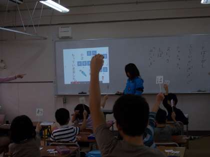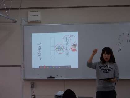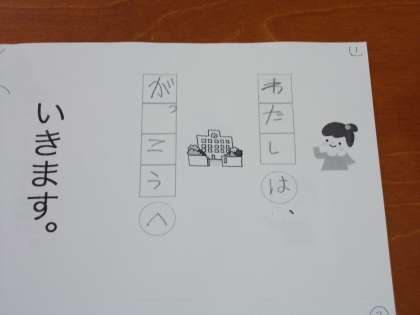 ICTや手作り教材をつかって、小さい「や」「ゆ」「よ」「つ」と助詞の「は」「へ」「を」がある文を書く学習をしました。