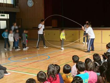 京都府ダブルダッチ協会の4名の先生にきていただき、ダブルダッチの出前授業をしてもらいました。かっこいいパフォーマンスを見せていただいたり、実際にコツを教えてもらい体験をさせてもらったり、世界選手権で優勝されたSPEEDという技を見せてもらえたりと、素敵な時間をすごすことができました。なわとびの楽しさ、奥深さを知る機会となりました。