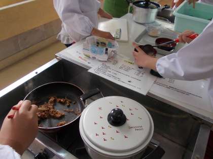 大阪ガスの出前授業で、食べ物やエネルギーを大切にするエコクッキングをしました。鍋でご飯を炊き、かつおぶしで出汁を取って味噌汁をつくりました。出汁を取ったかつおぶしは炒ってふりかけにして食べました。子どもたちは「おいしい!」と口ぐちに声をあげて食べました。