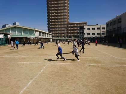 今年は、講堂に全校が集まっての6年生を送る会ができません。そこで、今日から卒業お祝い週間を設定し、20分休みに、一学年ずつ6年生と一緒に遊ぶことにしました。今日は、6年生と2年生が一緒に鬼ごっこをしました。