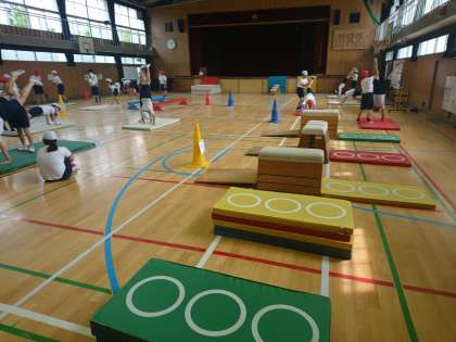 本校では、体育科でのカリキュラム編成の工夫をし、今の時期は、どの学年も器械運動に取り組むようにしています。器械運動は、跳び箱やマットなどの準備が大変なのですが、あらかじめ講堂にセッティングしておくことにより、すぐに学習にとりくめるように工夫しています。