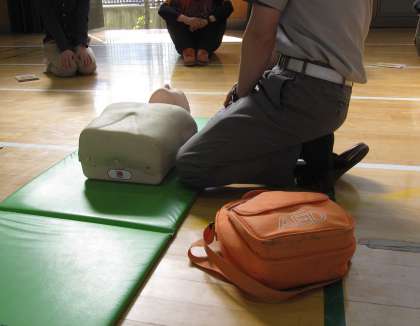 本日、港消防署の指導のもと、救命救急講習を行いました。AEDを使った心肺蘇生法や、担架を使っての傷病者の移動方法等を実習しました。尊い生命を救うために、正しい応急手当を身につけたいと感じました。