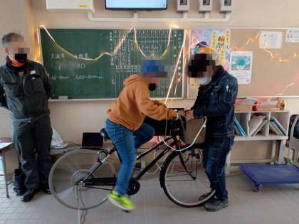 6年生と港区の企業の人たちで開発した「ぐるぐる発電」です。自転車の後輪が歯車になっており、それをこいで回すことで、発電します。ただ、発電するだけでなく、充電しておくことも可能です。