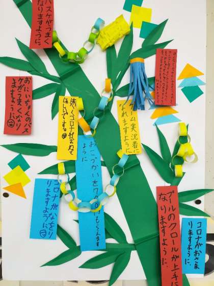 七夕、夏休みに向けて、図書委員会が短冊や課題図書のあらすじをわかりやすく掲示してくれています。図書開放も熱心に続けています。暑い日は図書室で本を楽しむのもいいですね。