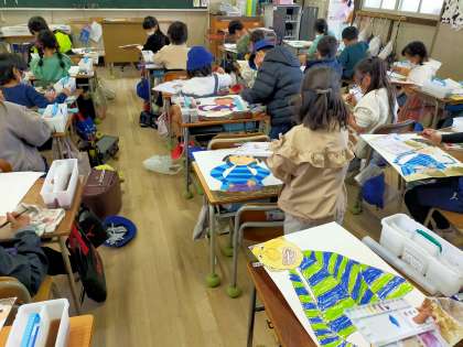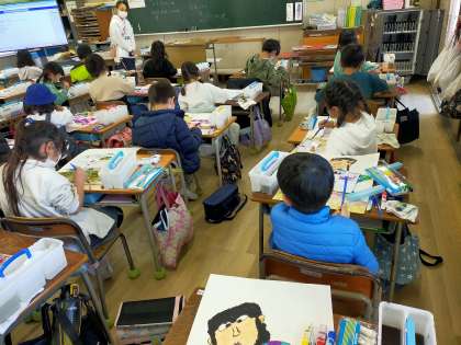 2年生の教室では、図画工作で絵に色付けをしていました。ダイナミックに描いた絵に、ド一人一人が集中して色付けしていました。出来上がりが楽しみです。