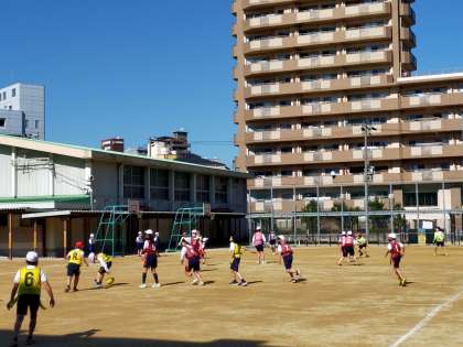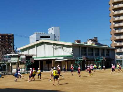春が来たような明るい日差しのなかで、5年生は、体育で「タグラグビー」に取り組んでいました。作戦を立てて成功した時の大喜びの様子や懸命に相手をかわし走り抜けるないスプレーなど白熱した試合が繰り広げられていました。