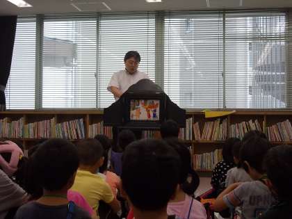 港図書館では、館長さんが図書館の利用の仕方の紙芝居をしてくださったり、子どもたちからの質問にていねいに答えていただいたりしたあと、館内を見学しました。