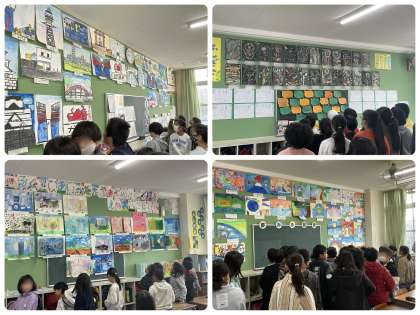 11月24日、他の学年の作品を全児童で見て回りました。今年は講堂建て替え中のため、いつもと違う展示方法ですが、子どもたちは興味深く鑑賞する姿が今年も見ることができました。