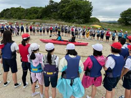準備をして、志摩自然学校のスタッフの皆さんに漕ぎ方、カヤックの乗り降りについて丁寧に教えていただき、陸上で練習しました。みんな次の本番に向けて真剣です。