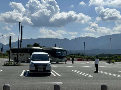 道の駅で2回目の休憩です。バスレクでクイズやゲーム、カラオケなど大盛り上がりをしている間に山々に囲まれた風景になっていました。到着が楽しみです
