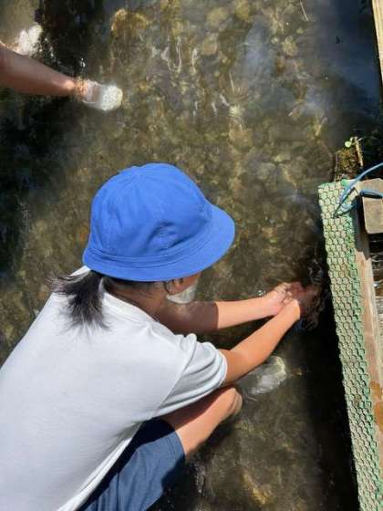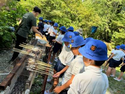 魚つかみとその魚を食べる体験をしました。まず宿の方から、「私たちは毎日、命をいただくことで生きることができている」と教えていただき、体験の意義をつかみました。そして、夢中になって魚をつかみ、焼いたものをいただくことで、命について一人一人が感じられることができた貴重な体験となりました。