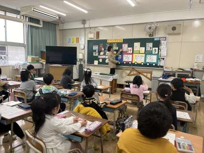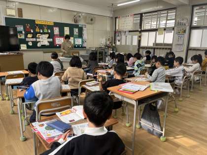 栄養教諭の先生に来ていただき、今年度2回目の栄養指導がありました。体を作るもとになる肉や魚類の「赤」、エネルギーのもとになる砂糖や油、炭水化物の「黄」、そして体の調子を整えるもとになる野菜や果物類の「緑」など、前回習ったことをよく覚えている児童が多く、プリントに書き込みながら楽しく学習ができました。「げんき列車」に子どもたちも大喜びでした。
